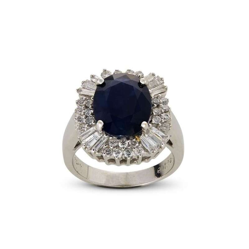 centering one oval sapphire; estimated to weigh: 4.75 carats and surrounded by baguette, full and single-cut diamonds; estimated total diamond weight: 0.75 carat.
