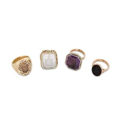 A collection of four gent's hard stone, gold and metal signet rings