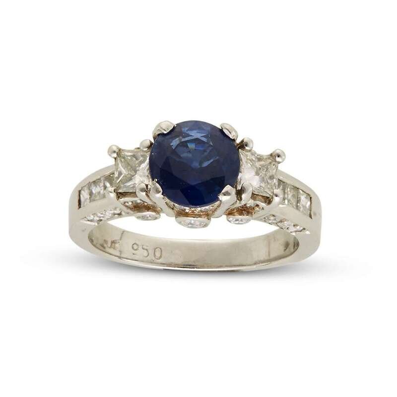 centering one round sapphire, weighing approximately 1.35 carats, accented by princess and round brilliant-cut diamonds; estimated total diamond weight: 0.90 carat.