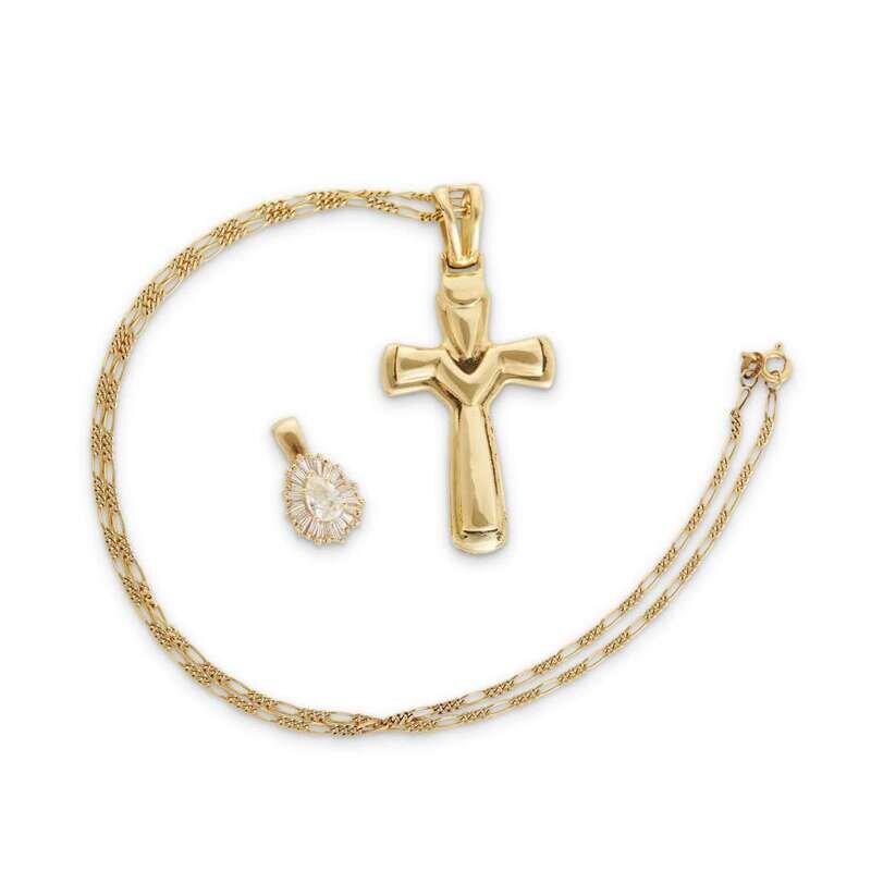 including a cruciform pendant and chain marked for eighteen karat together with a diamond pendant centering one pear shape diamond, weighing approximately 0.55 carat, surrounded by baguette-cut diamonds; estimated total remaining diamond weight: 0.40 carat.