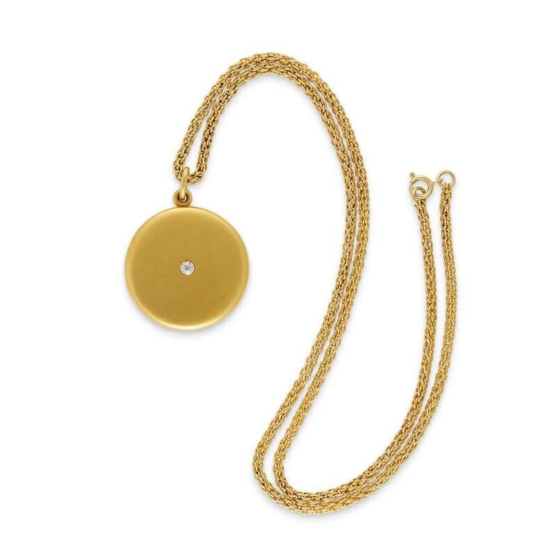 chain marked for eighteen karat with a gold locket set with an old European-cut diamond.
