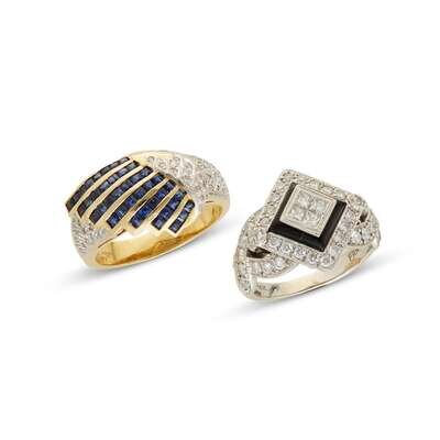 A collection of diamond, sapphire, black onyx and gold rings