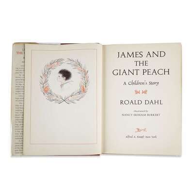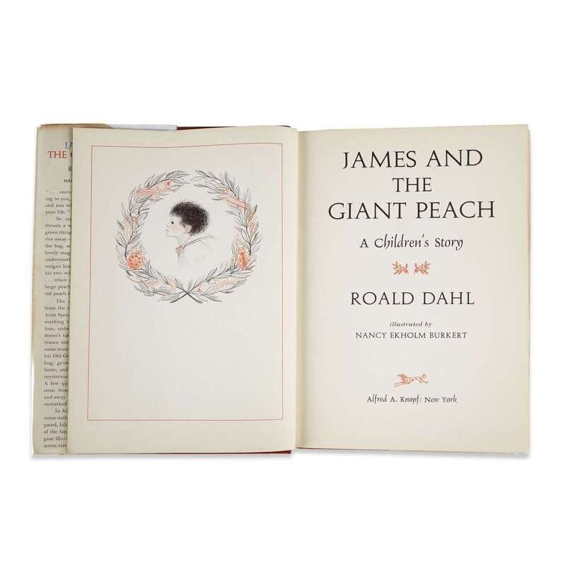 (Modern Literature Signed) 1 Vol. Dahl, Roald. James and the Giant Peach. New York: Knopf, (1961). Presumed second issue. Illustrated by Nancy Ekholm Burkett. Large 8vo, original red cloth; spine and edges sunned, corners bumped, spine ends frayed, other occasional edge wear, dust jacket (wear to edges and joints, darkening to edges, head of spine panel chipped away). Bookplate on paste down.