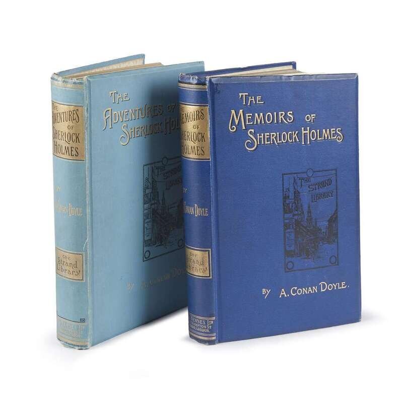 (Modern Literature) 2 Vols. Doyle, A. Conan. [Adventures & Memoirs of Sherlock Holmes]: The Adventures of Sherlock Holmes. London: George Newnes, 1892. First edition in book form, first issue. Illustrated by Sidney Paget. Tall 8vo, original pictorial, gilt-lettered light blue cloth, all edges gilt; corners a little bumped, front joint moderately scuffed, back joint lightly scuffed, spine ends a little scuffed. Minor foxing to front matter but internally generally clean, hinges intact, a few paper faults to back hinge, [first signature professionally treated?]. First binding state without name in street sign. De Waal 520; Gibson & Green A10a. * Doyle, A. Conan. The Memoirs of Sherlock Holmes. London: George Newnes, 1894. First edition in book form. Illustrated by Sidney Paget. Tall 8vo, original pictorial, gilt-lettered dark blue cloth, all edges gilt; light wear at corners, joints, and spine ends. Minor foxing to title-page and front matter, but internally generally clean. A tight, bright, attractive copy. De Waal 596; Gibson & Green A 14a. Together in custom cloth clam shell box.