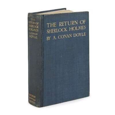 (Modern Literature) 1 Vol. Doyle, A. Conan. The Return of Sherlock Holmes. London: George Newnes, 1905. First [English] edition. Illustrated by Sidney Paget. 8vo, original gilt-lettered blue cloth; light edge wear. With 16 plates. Four pages advertisements at back. Dampstain affecting the very top blank margins of p. 306-348, including the top blank margins of 3 plates, but internally generally clean. A tight, attractive, generally bright copy.