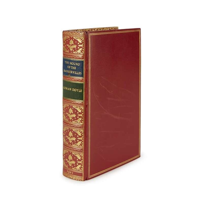 (Modern Literature) 1 Vol. Doyle, A. Conan. The Hound of the Baskervilles. Another Adventure of Sherlock Holmes. London: George Newnes, 1902. First book form edition, first issue. 8vo, later 20th-century full double-gilt fillet paneled and polished red calf, richly-gilt spine compartments, all edges gilt, inner dentelles gilt, green and navy blue morocco spine labels, original front cloth cover (a little trimmed) bound in at back by Bayntun; joints a little stressed, covers occasionally scuffed, a little trimmed. With 16 plates by Sidney Paget. Some scattered minor spotting, internally generally clean and crisp.