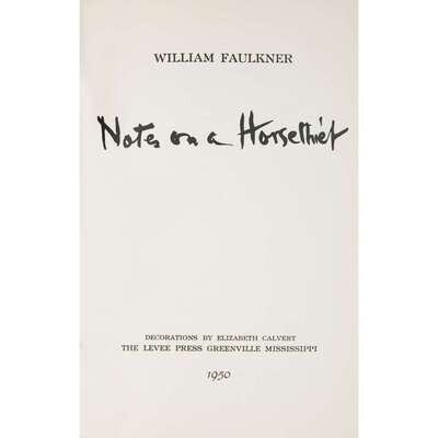 (Modern Literature Signed) 1 Vol. Faulkner, William. Notes on a Horsethief. Greenville, Mississippi: Levee Press, 1950. First edition, #858/975 signed by William Faulkner. Silver pictorial green cloth, corners and spine ends very slightly scuffed, glassine. Decorations by Elizabeth Calvert.