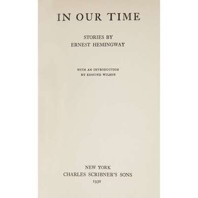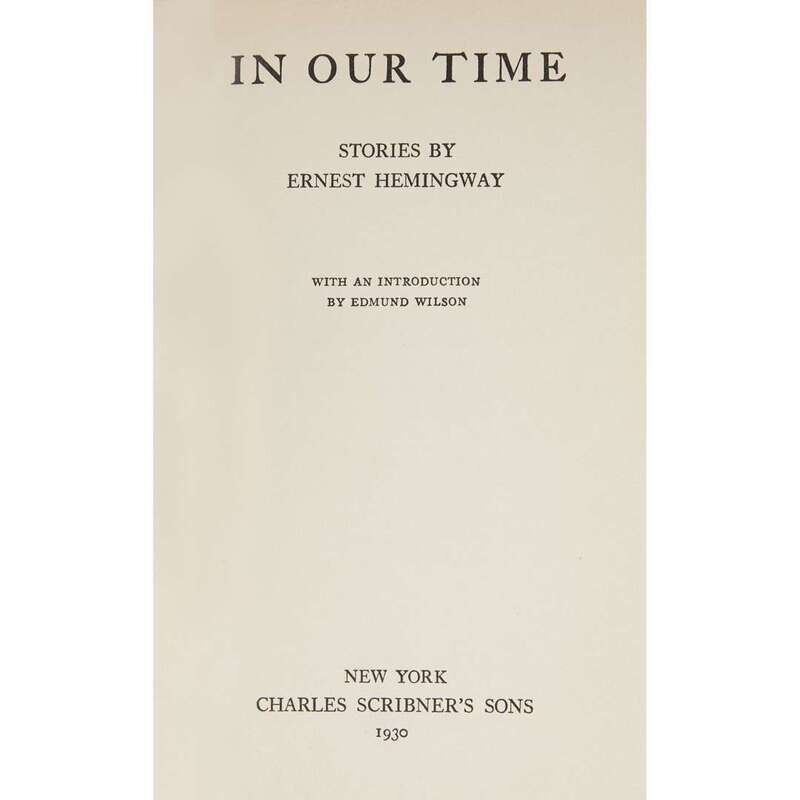 (Modern Literature) 1 Vol. Hemingway, Ernest. In Our Time. New York: Scribner's, 1930. Second American edition, revised. With an introduction by Edmund Wilson. 12mo, original black cloth, gold paper labels, fore edge untrimmed; light edge wear, corners slightly bumped, spine ends very slightly frayed, small chipping at head of paper spine label, dust jacket (some chipping and generally small paper losses at corners, top and bottom of spine panels, and at the very top and bottom of cover panels, spine panel showing some damp staining and starting to darken, the "S" at the end of "Scribner's" at foot of spine panel chipped away - no other losses to lettering or design elements). Small dampstain on top edge. Internally clean.