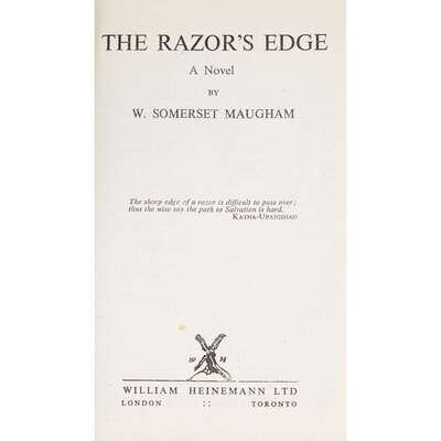 (Modern Literature) 1 Vol. Maugham, W. Somerset. The Razor's Edge. London: William Heinemann, (1944). First English edition. Small 8vo, original gilt-lettered blue cloth; light edge wear, dust jacket (some light creasing, a little dusty, edges starting to darken.) Very Good+.