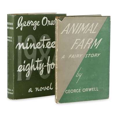 (Modern Literature) 2 Vols. Orwell, George: Animal Farm, A Fairy Story. London: Secker & Warburg, 1945. First edition, first printing. Small 8vo, original green cloth; corners and spine ends rubbed, other light edge wear, dust jacket (small chips at corners, chip 10 x 15 mm at top of front panel near spine panel, small paper losses at spine panel ends, spine panel joints often rubbed, minor wear to front flap joint - no losses to lettering or design elements. Slight stress to front hinge. Internally clean. Fenwick A10a. * Nineteen Eighty-Four. A Novel. London: Secker & Warburg, 1949. First edition, first printing. Small 8vo, original green cloth, top edge stained red; edges of covers and spine ends scuffed and turning brown, other scattered light scuffing to covers, dust jacket (minor edge wear), green variant. Light foxing to endpapers and fore edges. Early owner's ink gift presentation dated, "26. 7. 49" on front free endpaper recto. Fenwick A12a (green dust jacket state).