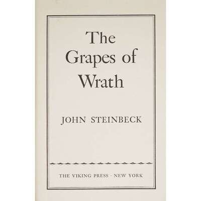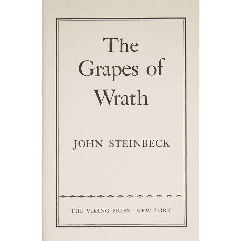 (Modern Literature) 1 Vol. Steinbeck, John. The Grapes of Wrath. New York: Viking, (1939). First edition edition. 8vo, original Pictor beige cloth; light wear, very slightly dusty, dust jacket (some edge wear, chips at head of spine panel - just touching outer edge of "s" in "Grapes," some creasing and very small chipping at foot of spine panel, flap panels often scuffed and starting to darken, a few small cello tape repairs to verso of ends of spine panel). Minor spotting to text block edges, light crease to bottom fore edge corner of title page, faint, small stain at blank fore edge corner of p. 11/12, very minor dust smudging at bottom fore edge corners. In first issue dust jacket with "First Edition" at foot of front flap, "$2.75" at head.