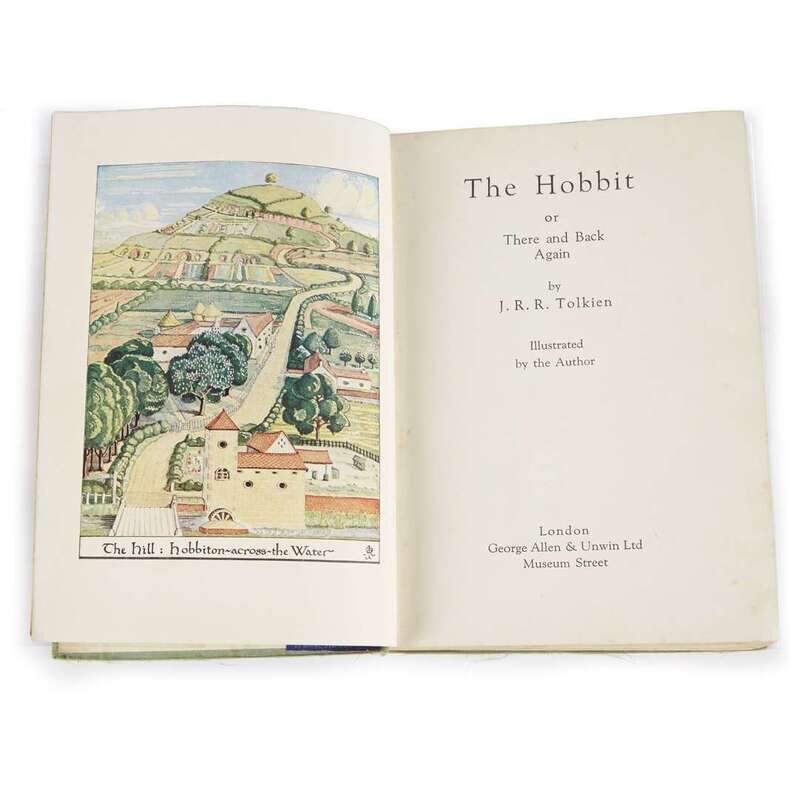 (Modern Literature) 1 Vol. Tolkien, J(ohn) R(onald) R(euel). The Hobbit. London: George Allen, (1937). First edition, second printing. 8vo, original black-stamped green cloth; bottom edges rubbed, some rubbing on upper edges, covers occasionally a little scuffed, slightly cocked. With 5 plates (4 in color), full-page illustration, endpaper maps. Some scattered internal spotting. In custom cloth clam shell box.
