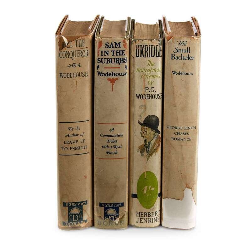 (Comic Fiction) 4 Vols. Wodehouse, P.G.: Ukridge. London: Herbert Jenkins, 1924. First edition. Small 8vo, original dark green-lettered and pictorial green cloth; minor wear, later dust jacket (ca. 1931) with some edge wear. McIlvaine A32a. * Bill the Conqueror. New York: George H. Doran, 1924. First American edition. 12mo, original blue-lettered and decorated orange cloth; corners just bumped, other light edge wear, occasionally very slightly dusty, dust jacket (chip at head of spine panel with loss of the letters "B" and "L" of "Bill," loss at bottom of spine panel touching foot of lettering, dampstain to back panel). Back hinge a little tender. McIlvaine A33b. * Sam in the Suburbs. New York: George H. Doran, (1925). First American edition. 12mo, original black-lettered and pictorial green cloth; corners a little bumped, other light edge wear, occasionally slightly scuffed, dust jacket (small chipping and light creasing at edges, loss at bottom of spine panel affecting publisher's device, abrasion at top third of back panel with loss of a few letters, some minor staining). Internally clean. McIlvaine A35b. * The Small Bachelor. New York: George H. Doran, (1927). First American edition. 12mo, original brown-lettered and decorated orange cloth; light edge wear, occasionally slightly dusty, dust jacket (bottom 1 1/2 inch of spine panel gone with loss of price and publisher's device, small chip at top edge of front panel with minor loss of design element, light spotting to back and spine panels). Some darkening to endpapers, but internally clean.