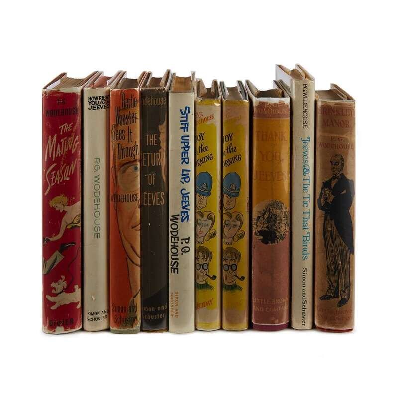 (Comic Fiction) 10 Vols. Wodehouse, P. G. [Jeeves and Wooster novels, First American printings - all in dust jackets]: Thank You, Jeeves! Boston: Little, Brown, 1934. First American edition. 12 mo, original black-stamped lavender cloth; light wear, dust jacket (some paper losses at top of front and spine panels - touching lettering, stress to front panel joint, often somewhat dusty). Some spotting to text block edges. McIlvaine A51b. * Brinkley Manor. Boston: Little Brown, 1934. First American edition. 12mo, original black-stamped orange-red cloth; light wear, edges often a little dusty, dust jacket (some edge wear, moderately dusty). Some spotting to endpapers and edges. McIlvaine A52b. * Joy in the Morning. Garden City: Doubleday, 1946. First edition. 12mo, original grey cloth; light wear, some spotting, dust jacket (price clipped, a little toned and dusty). Some toning to endpapers. McIlvaine A65a. * Another copy of the preceding, first edition, original cloth; moderate wear, dust jacket (price clipped, some chipping to edges, old cellotape repairs, some internal toning and spotting). * The Mating Season. New York: Didier, (1949). First American edition. 8vo, original white-stamped red cloth; light wear, some dust soiling, dust jacket (chipping and paper losses at edges and joints, abrasion to center of back panel - small losses to design elements). Some spotting to endpapers. McIlvaine A69b. * The Return of Jeeves. New York: Simon and Schuster, 1954. First American edition. 8vo, original boards; minor wear, dust jacket (light edge wear). McIlvaine A74b. * Bertie Wooster Sees it Through. New York: Simon and Schuster, 1955. First American edition. 8vo, original boards; minor wear, dust jacket (occasional light edge wear). McAlvaine A77b - second binding state. * How Right You are Jeeves. New York: Simon and Schuster, 1960. First edition. 8vo, original boards; minor wear, dust jacket (minor wear). McIlvaine A83a. * Stiff Upper Lip, Jeeves. New York: Simon and Schuster, 1963. First edition. 12mo, original boards; light wear, dust jacket (edges a little dusty). Internally toned. McIlvaine A86a. * Jeeves & The Tie That Binds. New York: Simon and Schuster, (1971). First American edition. 8vo, original yellow cloth, dust jacket. Light wear. A94b.