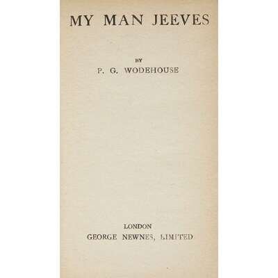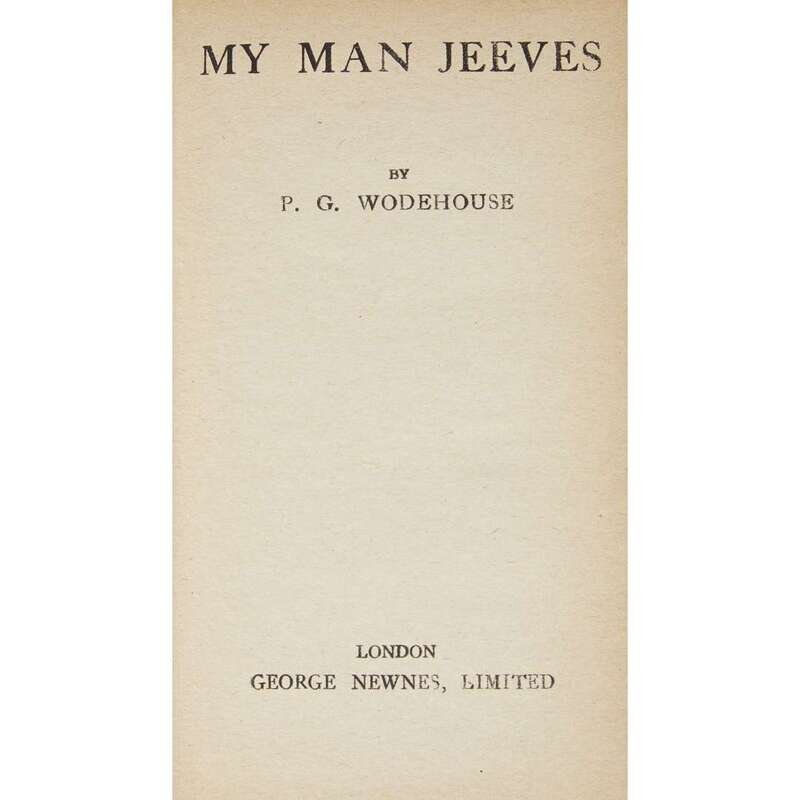 (Comic Fiction) 1 Vol. Wodehouse, P.G. My Man Jeeves. London: George Newnes, [1919]. First edition, first printing. 12mo, original salmon cloth, black stamped spine, blind stamped front cover; minor wear. Internally lightly and evenly toned. With the Butler and Tanner imprint at the bottom of p. 251. Complete with advertisement leaf and pastedown at back. Early ink ownership on front free endpaper recto, but an unusually sound, tight, clean - even bright copy in unfaded binding and even the paper in an unusually good state of preservation, in custom brown cloth clam shell box.
