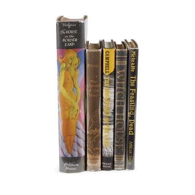 (Science Fiction & Horror) 5 Vols. (Arkham House Sauk City imprints): Bloch, Robert. The Opener of the Way. 1945. First edition. 12mo, original cloth; light edge wear, dust jacket (slightly dusty, some wear and darkening at joints and edges). Minor internal spotting. Inscribed, dated "1951" and signed in ink on front free endpaper by Robert Block. Very Good copy. Jaffery 10. * Walton, Evangeline. Witch House. 1945. First edition. 12mo, original cloth; light wear, dust jacket (slightly dusty, some light wear to edges). Light foxing to front endpapers. Very Good copy. Jaffery 11. * Hodgson, William Hope. The House on the Borderland. 1946. First edition. Large 8vo, original cloth; corners bumped, other light edge wear, occasionally slightly scuffed, dust jacket (minor wear). Some darkening and spotting to endpapers. Minor spotting to fore edges. Very Good copy. Jaffery 18. * Metcalfe, John. The Feasting Dead. 1954. First edition. 12mo, original cloth, dust jacket. Near Fine/Near Fine+ copy. Jaffery 48. * Campbell, J. Ramsey. The Inhabitant of the Lake and Less Welcome Tenants. 1964. First edition. 12mo, original cloth, dust jacket. Fine-/Fine copy. Jaffery 77.