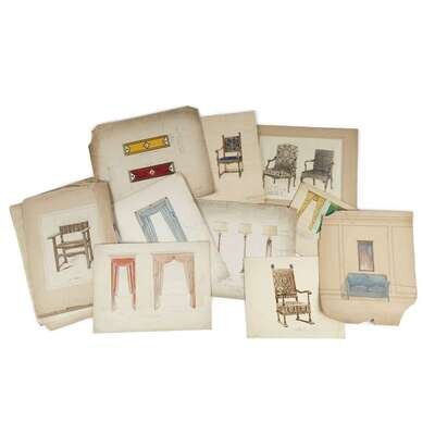 (Fashion) Lot. Original Wash and Pencil Drawings. Champman Dec. Co. Philadelphia, ca 1920. Designs for furniture (chairs, tables), lamps, draperies. 17 wash and pencil, pencil drawings on paper or illustration board, 12 x 10 inches; 305 x 250 mm and smaller. Scattered chipping to edges of boards, drawings in good to excellent states of preservation. Lot includes a few photo mechanical pieces
