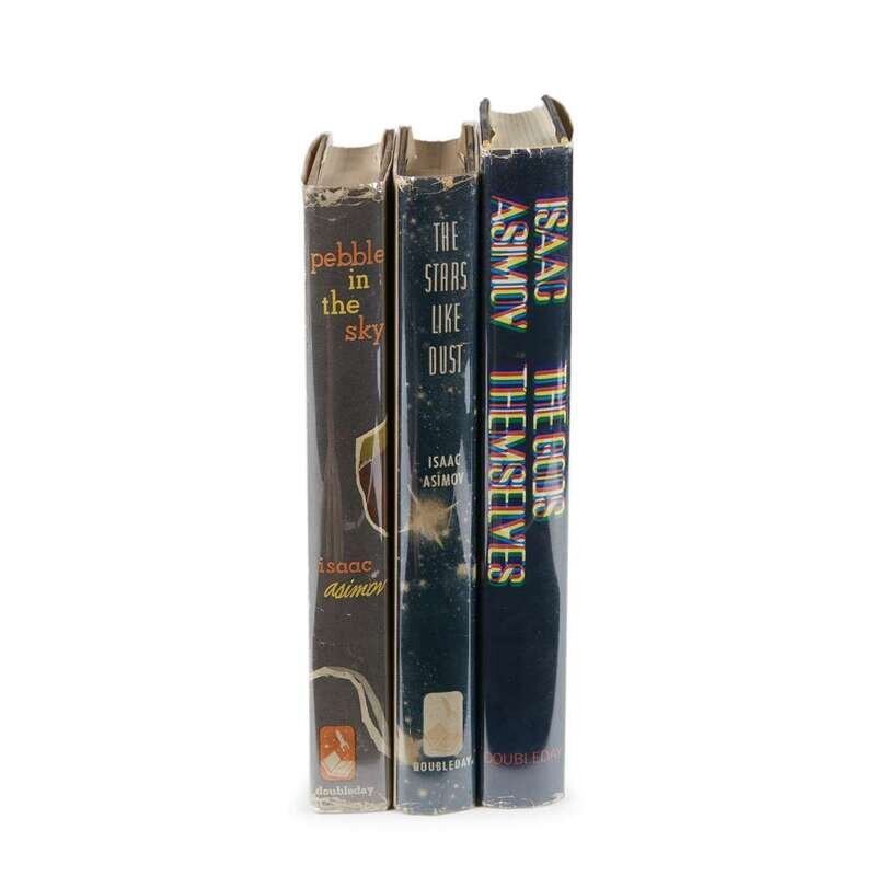 (Science Fiction & Horror) 3 Vols. Asimov, Isaac: Pebble in the Sky. Garden City: Doubleday, 1950. First edition. 12mo, original grey cloth, red-lettered spine; light wear, dust jacket (small chipping and light creasing at edges, occasionally slightly scuffed). Internally clean. Asimov's first book. Very Good/Very Good+ copy. Currey p. 19. * The Stars Like Dust. Garden City: Doubleday, 1951. First edition. 12mo, original dark blue cloth, white-lettered spine; corners slightly bumped, other minor edge wear, dust jacket (minor edge wear). Some very minor discoloration to free endpaper rectos. Internally clean. Very Good+/Near Fine- copy. Currey p. 19. * The Gods Themselves. Garden City: Doubleday, 1972. First edition. 12mo, original cloth, dust jacket. Ink ownership on front free endpaper recto. Near Fine copy. Currey p. 17.