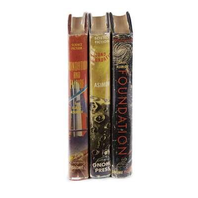 (Science Fiction & Horror) 3 Vols. Asimov, Isaac. [Foundation Trilogy - first editions]: Foundation. New York: Gnome, (1951). First edition. 12mo, original red-stamped black cloth; minor wear, corners very slightly bumped, dust jacket (small paper losses at cover panels' corners and at spine panel's ends, bottom third of front panel joint starting to split, stress and incipient splitting along back panel's joint, some spotting at edges of flaps - extremely negligible loss of lettering or design elements). Minor spotting to end papers. Internally clean. First binding state, first state of dust jacket. * Foundation and Empire. New York: Gnome, (1952). First edition. 12mo, original black-stamped red cloth; minor edge wear, dust jacket (small paper losses at cover panels' corners and bottom of spine panel, a few small chips at edges, light spotting to flaps - no losses to lettering or design elements). Internally clean. First binding state (22 mm wide spine imprint), first state of dust jacket. * Second Foundation. [New York]: Gnome, (1953). First edition. 12mo, original brown-lettered blue cloth; corners just bumped, spine ends a little rubbed, dust jacket (small chipping at edges, some spotting to flap, a few small repairs to short tears on verso, a few small abrasions on spine panel some small scattered losses to spine lettering). Light spotting to end papers, internally clean. First binding state. Attractive set.