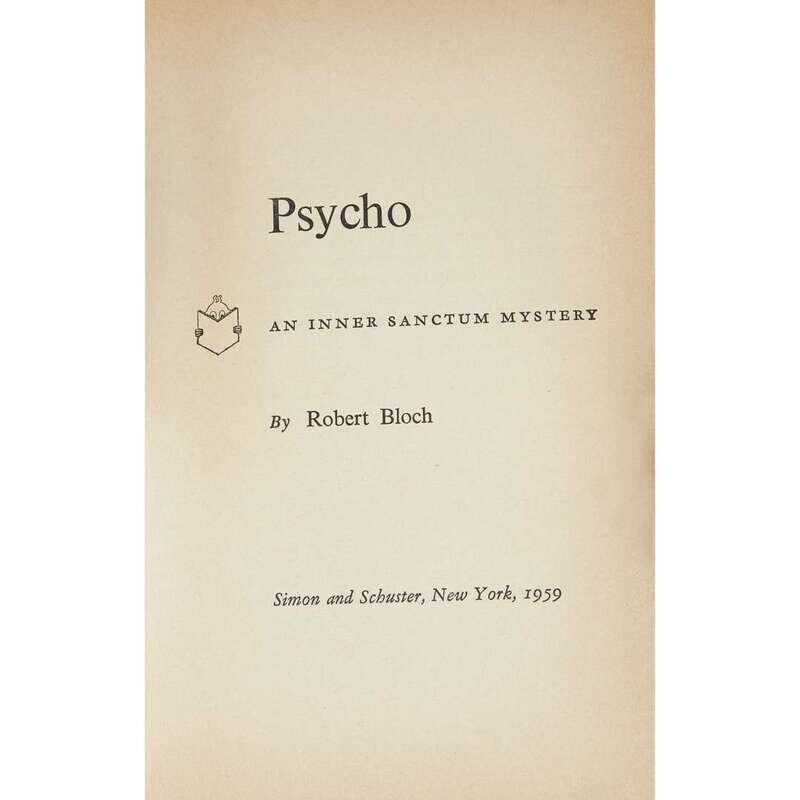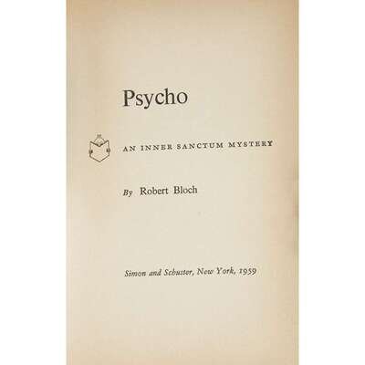 (Science Fiction & Horror) 1 Vol. Bloch, Robert. Psycho. New York: Simon and Scuster, 1959. First edition, first printing. 12mo, yellow cloth-backed black boards; light edge wear, dust jacket (small chip at top of spine panel, occasional small chipping and minor creasing at edges, minor smudging to back panel, light, scattered foxing to verso). Contents toned as usual.