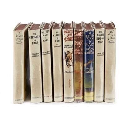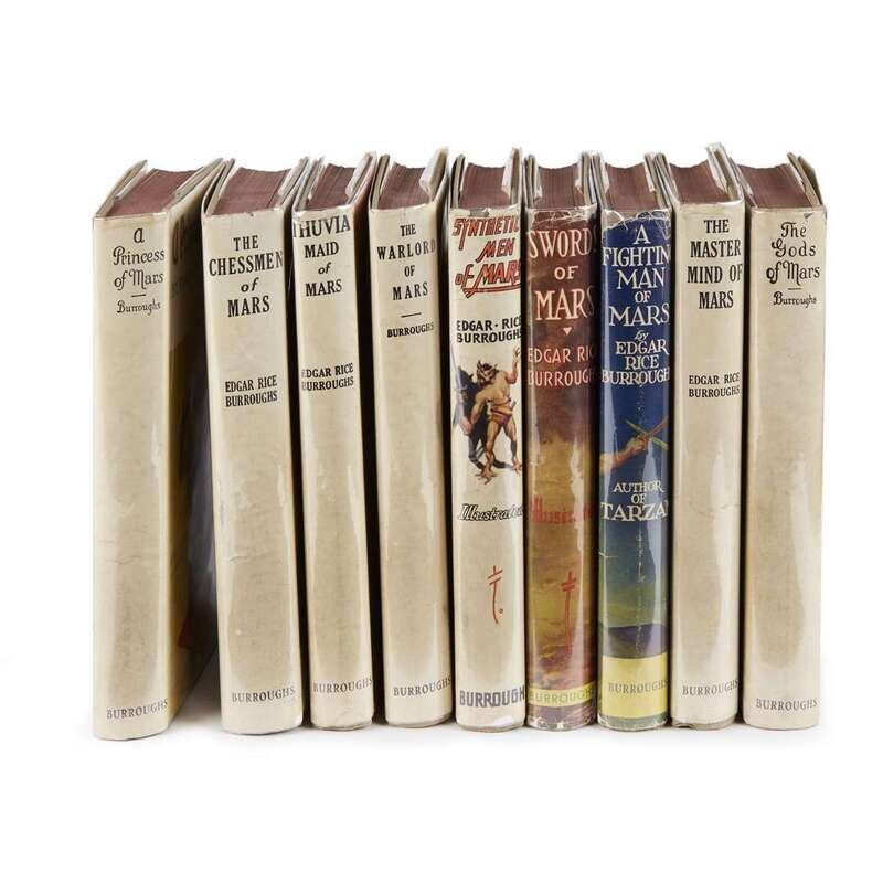 (Science Fiction & Horror) 9 Vols. Burroughs, Edgar Rice. [Mars titles]: A Princess of Mars. * The Gods of Mars. * The Warlord of Mars. * Tuvia, Maid of Mars. * The Chessmen of Mars. * The Mastermind of Mars. * A Fighting Man of Mars. * Swords of Mars. * Synthetic Men of Mars. * All Tarzana: Burroughs, [1948]. All 12mo, original burgundy-lettered tan-gray cloth; minor wear, original dust jackets (scattered minor paper losses). Bright, attractive copies of the 1948 Burroughs reprints in their well-preserved dust jackets.