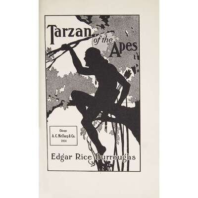 (Science Fiction & Horror) 1 Vol. Burroughs, Edgar Rice. Tarzan of The Apes. Chicago: A. C. McClurg, 1914. First edition, first issue, first state. 12mo, original gilt-lettered red cloth, spine gilt; minor wear. Title vignette. Some stress to back hinge. Book plate of Jean Hersholt on front pastedown. In custom half morocco and cloth slipcase and chemise.