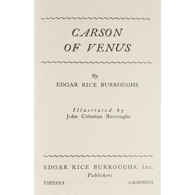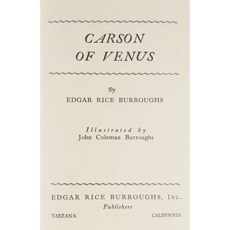 (Science Fiction & Horror : Signed Copies) 1 Vol. Burroughs, Edgar Rice. Carson of Venus. Tarzana: Burroughs, (1939). First edition. 12mo, original red-stamped blue pebbled cloth; light wear, some scuffing to top of back cover, dust jacket (minor wear). Illustrated by John Coleman Burroughs. With 6 plates. Internally clean in bright dust jacket.
