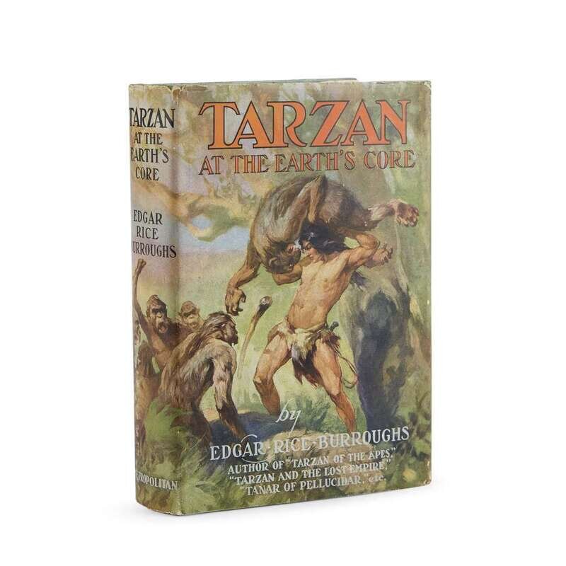 (Science Fiction & Horror) 2 Vols. Burroughs, Edgar Rice. [Tarzan titles - first editions]: Tarzan and the Jewels of Opar. Chicago: A. C. McClurg, 1918. First edition, first printing. Illustrated by J. Allen St. John. 12mo., original gilt-lettered and decorated green cloth; light edge wear, corners just bumped, spine ends very slightly frayed, a little cocked. With 8 plates. Advertisements at back. Endpapers a little dusty, scattered internal spotting and small dust smudging. Zeuschner 598. * Tarzan at the Earth's Core. New York: Metropolitan, (1930). First edition. Illustrated by J. Allen St. John. 12mo, original black-lettered green cloth; minor edge wear, original laminated dust jacket (minor edge wear). Frontispiece. Internally clean. Bright, attractive copy. Zeuschner 664 (illustrating the dust jacket design as in this copy - on page 177).