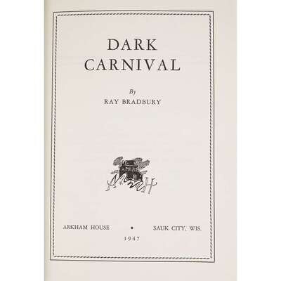 (Science Fiction & Horror) 1 Vol. Bradbury, Ray. Dark Carnival. Sauk City: Arkham House, 1947. First edition. 12mo, original black cloth, dust jacket. Bookplate of Robert Fontinelle on front free endpaper recto, dated in ink at top of front free endpaper recto.