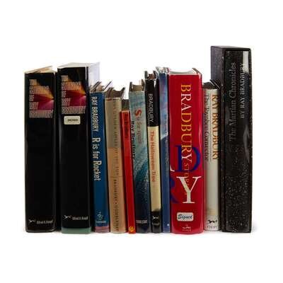 (Science Fiction & Horror) 11 Vols. Bradbury, Ray [signed and inscribed copies]: The Golden Apples of the Sun. Garden City: Doubleday, 1953. First edition. 8vo, original cloth; light to moderate wear, dust jacket (price clipped, some creasing, chipping at edges, a little dusty). Darkening to endpapers. Slip signed in ink by Bradbury inserted. * R is for Rocket. Garden City: Doubleday, (1962). First edition. 8vo, original cloth, dust jacket. Signed on title page in black ink (felt?) by Ray Bradbury. Near Fine/Near Fine+ copy. * S is for Space. Garden City: Doubleday, 1966. First edition. 8vo, original cloth; light edge wear, dust jacket (minor wear). Inscribed and dated "Mar. 25, 1982," in black ink (felt?) on front free endpaper recto by Ray Bradbury. Very Good+ copy. * The Halloween Tree. New York: Knopf, 1972. First edition. 4to, original cloth, dust jacket. Inscribed, dated "Mar. 25, 1982," and signed twice in black and blue ink (felt?) on label mounted to front paste down by Ray Bradbury. Near Fine copy. * The Martian Chronicles. Avon, Connecticut: Limited Editions Club, 1974. #598/2,000 signed by Ray Bradbury, et al. 4to, original silver decorated cloth, slipcase. Near Fine+/Fine copy. * The Stories of Ray Bradbury. New York: Knopf, 1980. First edition. Large 8vo, original cloth, dust jacket. Inscribed, dated "3/17/89," and signed and embellished with a drawing all in blue ink on front free endpaper by Ray Bradbury. Near Fine/Near Fine+ copy. * The uncorrected proof issue of the preceding, original wrappers, signed and dated "May 29, 1980," in black ink (felt?) on half title, Near Fine+. * The Toynbee Convector. New York: Knopf, 1988. First edition. 8vo, original boards, dust jacket. Signed in ink on front free endpaper recto by Ray Bradbury. Fine copy. * Ahmed and the Oblivion Machines. New York: Avon, (1988). First edition. 8vo, original boards, dust jacket. Signed by Ray Bradbury in black ink (felt?) on title page. Fine copy. * Bradbury Stories. (New York): William Morrow, (2003). First edition. Large 8vo, original boards, dust jacket. Inscribed, dated "Oct. 31 04," and signed in blue ink (felt) on half title by Ray Bradbury. Fine copy. * Lot also includes The Pegasus Library Ray Bradbury, (London), (1975). 12mo, original stiff wrappers, inscribed, dated, "Mar. 25, 1982," and signed in black ink (felt?) on half title by Ray Bradbury. Minor wear.