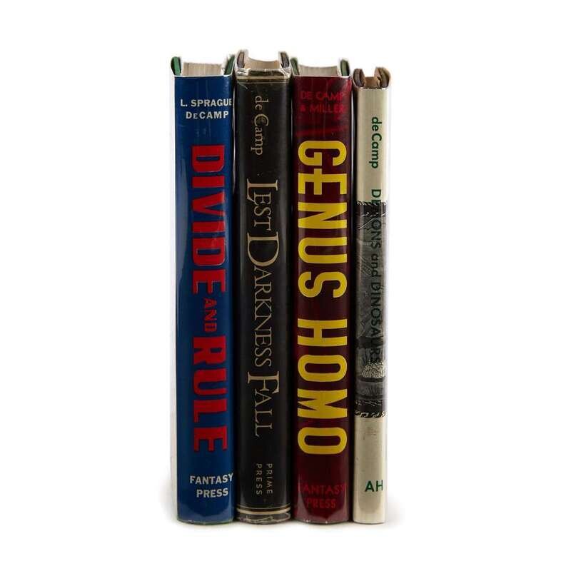 (Science Fiction & Horror) 4 Vols. Sprague De Camp, L. Signed Copies: Divide and Rule. Reading: Fantasy, 1948. First edition, #146/500 signed by L. Sprague de Camp. 12mo, original green cloth, spine gilt, minor wear, dust jacket (some very minor dust smudging at edges). Dated, "12-5-48," in ink at top of front free endpaper recto. Also inscribed to Robert E. Fontinelle by L. Sprague de Camp on limitation page. Tight, bright copy. Currey p. 133 - issue A. * Lest Darkness Fall. Philadelphia: Prime, (1949). 12mo, original cloth; minor wear, dust jacket (minor edge wear, occasionally a little dusty). Inscribed, dated, "4/1/88," and signed by L. Sprague de Camp on title page. Tight, bright copy. * Genus Homo. Reading: Fantasy, 1950, #15/500 signed by L. Sprague de Camp and P. Schuyler Miller (the co-author). 12mo, original green cloth, spine gilt; light wear, edges a little dusty, dust jacket (minor wear). Some dust smudging to endpaper gutters. Additionally inscribed to Allan F. Reiland in green ink by P. Schuyler on limitation page. Generally attractive copy in bright dust jacket. Currey p. 133 - issue A. * Desmond and Dinosaurs. Sauk City: Arkham House, 1970. First edition. 12mo, original cloth; minor wear, dust jacket (minor edge wear). With label inscribed and signed by L. Sprague de Camp mounted to front free endpaper recto. Generally attractive copy. Jaffrey 113.