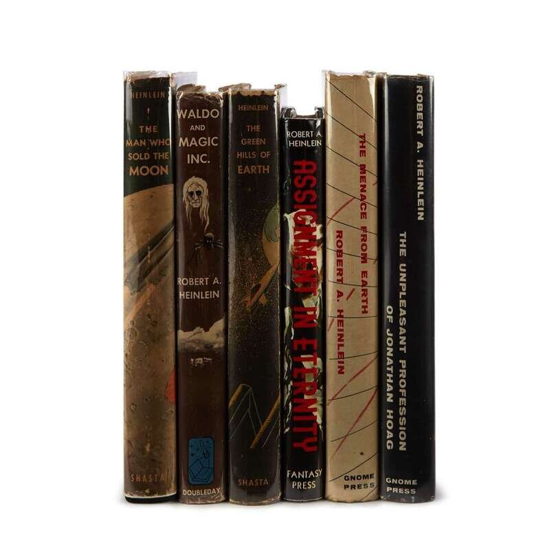 (Science Fiction & Horror) 6 Vols. Heinlein, Robert A.: The Man Who Sold the Moon. Chicago: Shasta, (1950). First edition, trade issue. 8vo, original two-tone cloth; light edge wear, dust jacket (minor edge wear, edges starting to darken, a few small chips and a few small close tears at edges). Very Good+/Near Fine- copy. Currey p. 233. * Waldo and Magic, Inc. Garden City: Doubleday, 1950. First edition. 8vo, original cloth; light to moderate edge wear, dust jacket (small chipping at edges, slightly dusty). A little discoloration to endpapers. Very Good copy. Currey p. 235. * The Green Hills of Earth. Chicago: Shasta, (1951). First edition, trade issue. 8vo, original cloth and boards; corners rubbed, head of spine starting to wear, dust jacket (small chipping at head of spine panel, other minor edge wear, back panel a little dusty - no loss of lettering or design elements). Stamped ownership on half title. Very Good/Very Good+ copy. Currey p. 232. * Assignment in Eternity. Reading: Fantasy, (1953). First edition, trade issue. 12mo, original black-lettered blue cloth, dust jacket. Near Fine/Near Fine+ copy. Late binding state. See Currey p. 232. * The Menace fom Earth. New York: Gnome, (1959). First edition. 12mo, original cloth, dust jacket. Dusty, internally browned copy, without price on complete dust jacket. Currey p. 233. * The Unpleasant Profession of Jonathan Hoag. Hicksville: (1959). First edition. 8vo, original cloth; minor wear, dust jacket (minor edge wear). Internally toned. Very Good copy. Currey p. 235.