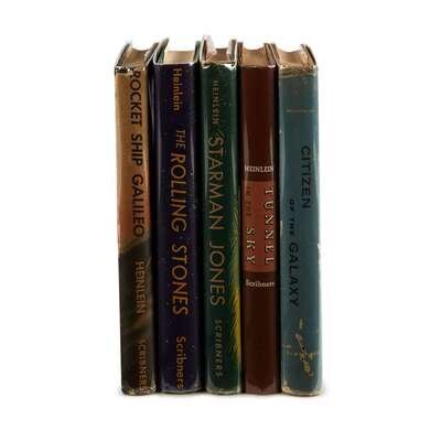 (Science Fiction & Horror) 5 Vols. Heinlein, Robert A.: Rocket Ship to Galileo. New York: Scribner's, (1947). First edition. 12mo, original green stamped black cloth; light wear, dust jacket (price clipped, light edge wear). Full page illustrations. Minor discoloration on front endpapers. Later state dust jacket with stamped $2.50 price on front flap. Generally attractive copy. Currey p. 234. * The Rolling Stones. New York: Scribner's, (1952). 12mo, original black and white stamped pictorial green cloth; corners bumped, other light edge wear, dust jacket (minor creasing). Full-page illustrations. Internally generally clean. Attractive copy. Currey p. 234. * Starman Jones. New York: Scribner's, (1953). First edition. 12mo, original black-stamped pictorial green cloth; corners bumped, other light wear, dust jacket (price clipped, some small edge wear). Endpapers a little toned. Illustrations. Currey p. 234. * Tunnel in the Sky. New York: Scribner's, (1955). First edition. 12mo, original black-stamped pictorial brown cloth; light edge wear, dust jacket (price clipped, some minor creasing, small chips and a few dust smudges to back flap, $2.75 price stamped at top of front flap). Bookplate on front free endpaper recto. Currey p. 234. * Citizen of the Galaxy. New York: Scribner's, (1957). First edition. 8vo, original red-stamped grey cloth; generally light edge wear, dust jacket (scattered small chips at edges, some wear and small abrasions along panel and flap joints, a few small abrasions to back panel). Internally clean. Currey p. 232.