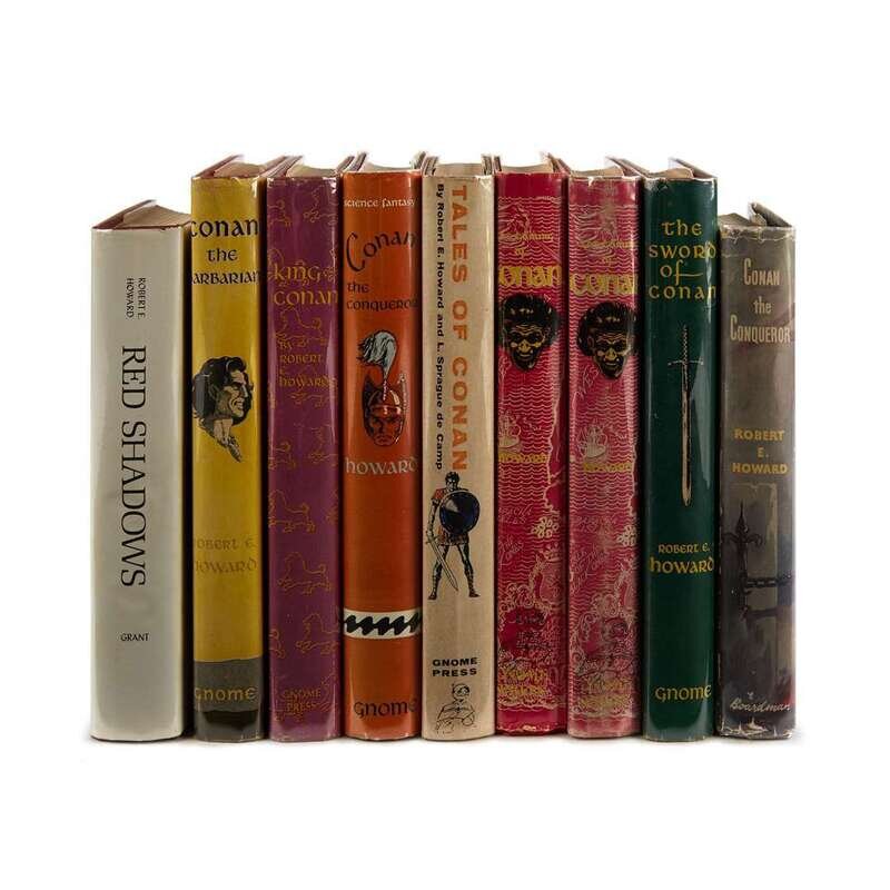 (Science Fiction & Horror) 9 Vols. Howard, Robert E. [Conan titles]: Conan the Conqueror. New York: Gnome, (1950). First edition, first printing. 12mo, original cloth; minor wear, dust jacket (minor wear). Fine copy. Currey p. 249. * First British edition of the preceding, London: Boardman, (1954). Original cloth; corners bumped, dust jacket (price clipped, some creasing). * The Swoard of Conan. New York: Gnome, (1952). First edition, first printing. 12mo, original cloth; light wear, dust jacket (light wear, some foxing to verso, some light foxing to back panel). But a tight, attractive copy. Currey p. 252. * The Coming of Conan. New York: Gnome, (1953). First edition. 12mo, original cloth (occasionally dusty). Near Fine-/Near Fine copy. Currey p. 249. * Another copy of the preceding, first edition, original cloth, dust jacket, Very Good+/Near Fine- copy. * King Conan. New York: Gnome, (1953). First edition, first printing. 12mo, original cloth; minor wear, dust jacket (some foxing to verso, scattered light foxing to back panel and front flap). But attractive copy. Currey p. 250. * Conan the Barbarian. New York: Gnome, (1954). First edition. 12mo, original cloth; minor wear; dust jacket (scattered light foxing). Scattered foxing to endpapers. Internally moderately browned. Currey p. 249. * Tales of Conan. New York: Gnome, 1955. First edition. Revised by Sprauge de Camp. 12mo, original cloth; some darkening and light wear to edges, dust jacket (some foxing to verso). Light foxing to endpapers. Internally browned. Currey p. 252, binding state D. * Red Shadows. West Kingston: Donald M. Grant, 1968. First edition, first state. 12mo, original cloth, dust jacket. 4 plates. Near Fine+ copy. Currey p. 251.