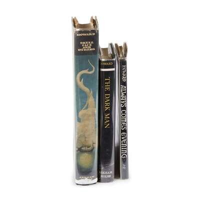 (Science Fiction & Horror) 3 Vols. Howard, Robert E. [Arkham House imprints]: Skull-Face and Others. Sauk City, 1946. First edition. 8vo, original black cloth, spine gilt; light edge wear, occasionally a little scuffed, dust jacket (small paper losses at corners, paper loss at foot of spine panel - affecting and mostly effacing the "House" on the spine panel imprint, darkening at top of back panel, and back panel joint, and at flap joints). End paper gutters and edges starting to darken, faint, small dampstain at top of fore edges, edges slightly toned. Jaffery 19. * Always Comes Evening. Sauk City, 1957. First edition. 12mo, original black cloth; light edge wear, dust jacket (minor edge wear). Moderate darkening to paste downs, some darkening to free endpapers. Jaffery 49. * The Dark Man and Others. Sauk City, 1963. First edition. 12mo, original black cloth, spine gilt; minor wear, dust jacket (minor wear, occasionally slightly scuffed). Near Fine- copy. Jaffery 73.