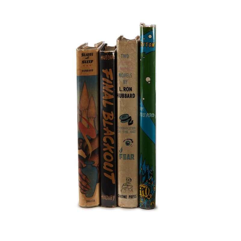 (Science Fiction & Horror) 4 Vols. Hubbard, L. Ron. Final Blackout. Providence: Hadley, (1948). First edition. 12mo, original pebbled black cloth; minor wear, dust jacket (some darkening to edges, minor edge wear, a little dusty). Internally clean. Very Good+ or better copy. Currey p. 256. * Slaves of Sleep. Chicago: Shasta, 1948. First edition. 12mo, original grey cloth, gilt-lettered spine; light wear, dust jacket (some darkening to edges). Minor spotting to endpapers. Very Good+ or better copy. Currey p. 256. * Triton and Battle of Wizards. Los Angeles: Fantasy, 1949. First edition. 8vo, original gilt-lettered blue cloth; light wear, some light scuffing to back cover, dust jacket (minor wear). Some spotting to endpapers. Very Good+ copy. Currey p. 256. * Typewriter in the Sky; Fear. New York: Gnome, (1951). First edition. 12mo, original cloth; light edge wear, dust jacket (small chipping at edges, some darkening and dust soiling at edges, a little dampstaining to back panel. Internally clean. Very Good copy. Currey p. 257.