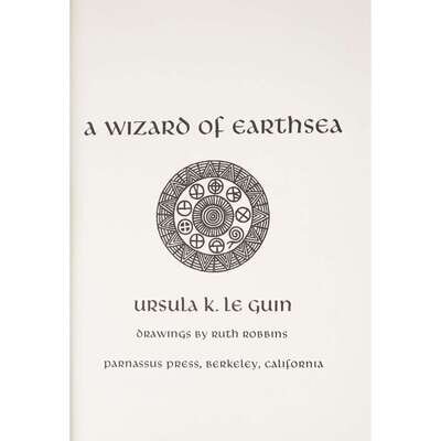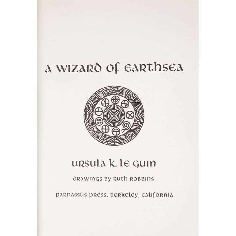 (Science Fiction & Horror) 1 Vol. Le Guin, Ursula K. A Wizard of Earthsea. Berkeley: Parnassus Press, (1968). First edition, first printing. 8vo, original pictorial green cloth; minor wear to edges and flap joints, small paper losses at corners and head of spine panel. Internally clean, ink ownership on front free endpaper.
