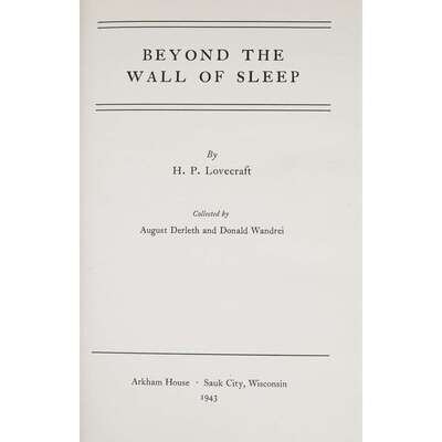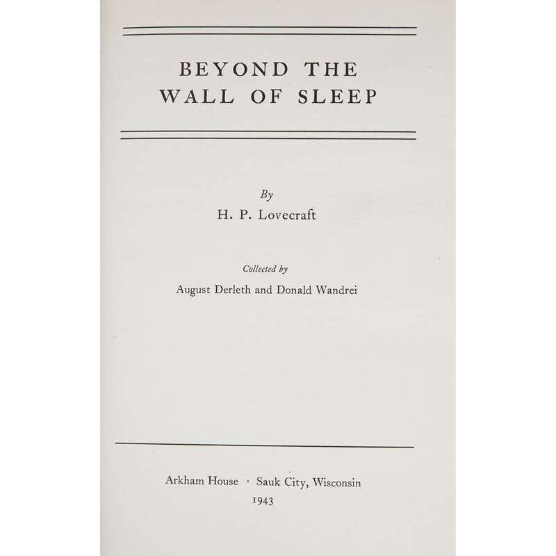 (Science Fiction & Horror) 1 Vol. Lovecraft, H. P. Beyond the Wall of Sleep. Sauk City: Arkham House, 1943. First edition. Large 8vo, original black cloth, spine gilt; light wear, some cuffing and creasing to the bottom of the spine affecting the gilt lettering, dust jacket (minor wear). Near Fine+ or better copy.