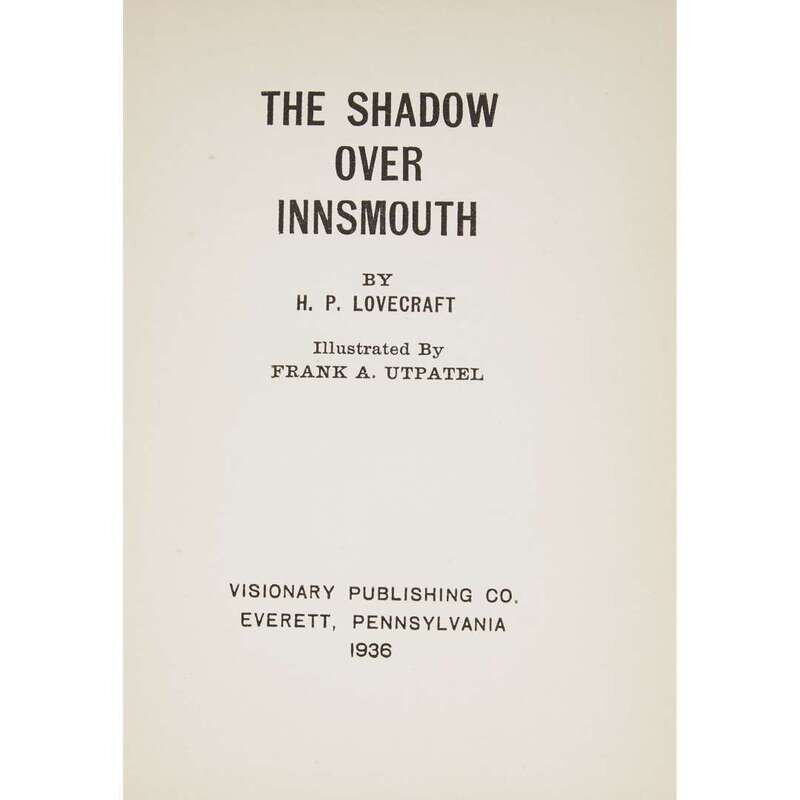 (Science Fiction & Horror) 1 Vol. Lovecraft, H(oward) P(hillips). The Shadow Over Innsmouth. Everett, Pennsylvania: Visionary Publishing Co., 1936. First edition. Illustrated by Frank A. Utpatel. 12mo, original silver-lettered black cloth; light wear, dust jacket (minor wear) silver-lettered white paper stock variant without illustration. Frontispiece and three full-page illustrations. Errata sheet inserted. Pencil ownership on front pastedown, dated Nov. 1936. Label inscribed, "Best," and signed by Frank Utpatel [the illustrator] inserted. With Howard Phillips Lovecraft bookplate on front free endpaper recto. Tight, bright copy in custom cloth clam shell box. Authenticity of the Lovecraft bookplate not guaranteed. Lovecraft's first book.