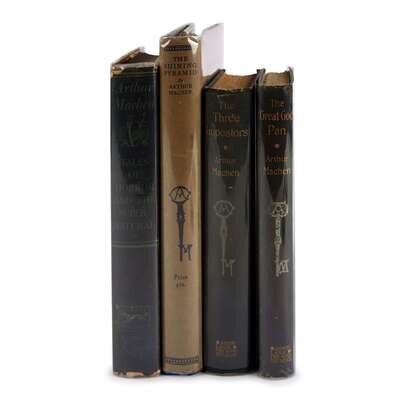 (Science Fiction & Horror) 4 Vols. Machen, Arthur: The Great God Pan and The Inmost Light. London: John Lane, 1894. First edition. 8vo, original white stamped pictorial blue cloth, gilt-letterd spine, top edges rough trimmed, other edges untrimmed; corners just bumped, light wear to spine ends, occasionally a little scuffed. Endpapers and front fly spotted and discolored. With 16 pages of undated publisher's advertisements at back. Bookplate on front free endpaper recto. Front binding cover and title page design by Aubrey Beardsley. First binding state. Cutler and Stiles p. 107. * The Three Imposters. London: John Lane, 1895. First edition. 8vo, original white-stamped blue cloth, gilt-lettered spine, top edge rough trimmed, other edges untrimmed; corners just bumped, light wear to spine edges, occasionally a little scuffed. Some spotting and minor damp staining to endpapers. With 30 pages of publisher's advertisements at back. Bookplate on front pastedown. Contents a little toned. Front cover binding and title page design by Aubrey Beardsley. First binding state. Cutler and Stiles p. 108. * The Shining Pyramid. London: Martin Secker, 1925. #237/250 signed by Arthur Machen. Tall 8vo, original blue cloth, gilt-lettered spine, front and bottom edges untrimmed; light edge wear, occasionally slightly scuffed, dust jacket (light wear). Some discoloration to endpapers, internally clean. Attractive copy. * Tales of Horror and The Supernatural. New York: Knopf, 1948. First edition thus. 8vo, original brick red cloth; light wear, dust jacket (some chipping at edges). Some toning to endpapers.
