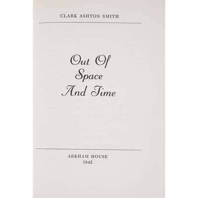 (Science Fiction & Horror) 1 Vol. Smith, Clark Ashton. Out of Space And Time. [Sauk City]: Arkham House, 1942. First edition. 12mo, original black cloth, gilt-lettered spine; light wear, corners and spine ends very lightly frayed, dust jacket (price clipped, light wear and slight darkening to edges and flap joints). Endpapers a little toned, showing some scattered light spotting. Unobtrusive, light stain at top of fore edges. But internally clean, generally attractive copy.