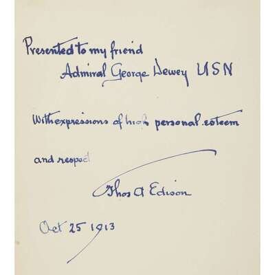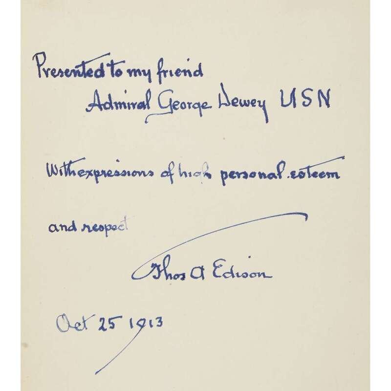 Signed presentation in ink on front free end paper recto: "Presented to my friend / Admiral George Dewey USN / with expressions of his personal esteem / and respect / Thomas a Edison / Oct 25 1913."