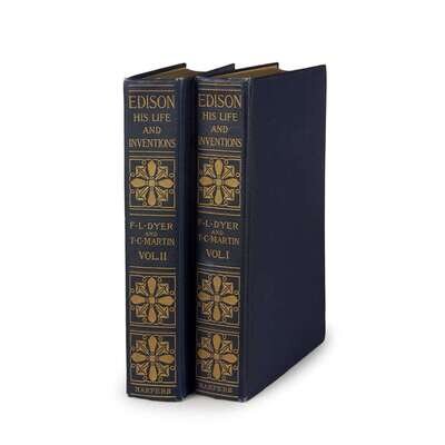 (History of Science : Signed Books) 2 Vols. Dyer, Frank Lewis; Martin, Thomas Commerford. Edison, His Life and Inventions. New York: Harper & Brothers, 1910. First edition. 8vo, original blue cloth, gilt spines, top edges gilt, light edge wear. Frontispieces, plates. Internally clean. Book plate of David Roland Clark on front paste downs.