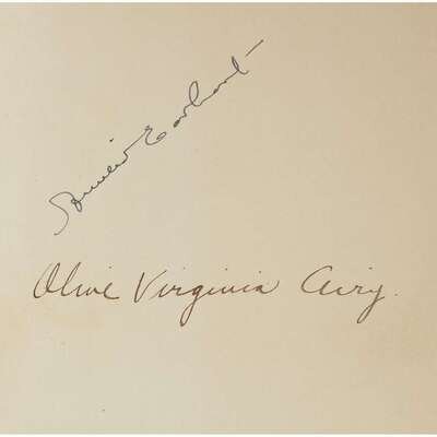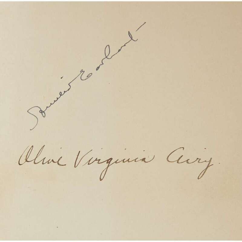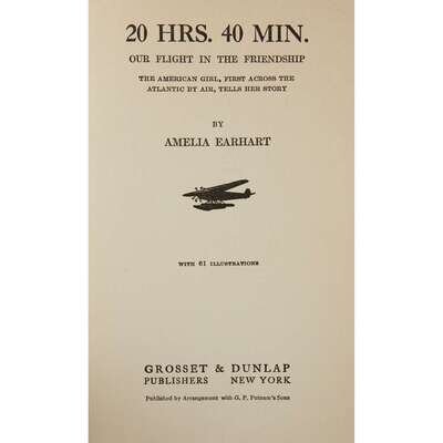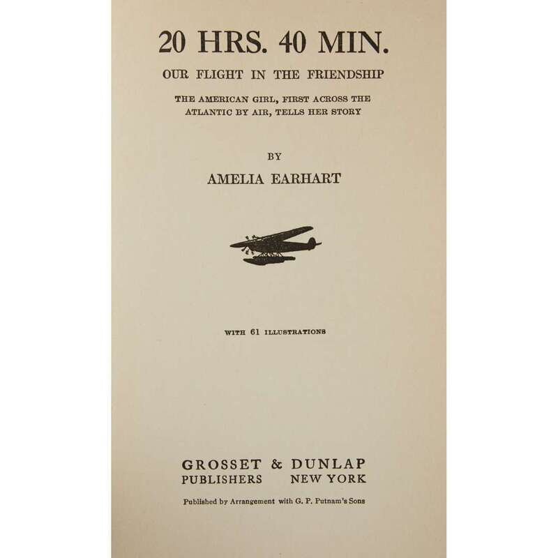 (History of Aviation) 1 Vol. Earhart, Amelia. 20 HRS. 40MIN.: Our Flight in the Friendship. New York: Grosset & Dunlap, (1928). 8vo, original orange-lettered blue cloth, top edge stained orange. Photo plates. Signed in pen on front free endpaper recto by Amelia Earhart. Also with the ownership signature of Olive Virginia Cury on front free endpaper recto. Tight, bright, complete copy in custom gilt lettered quarter navy blue morocco and green-blue cloth case and chemise.