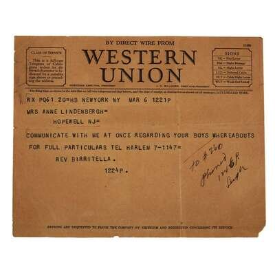 (History of Aviation : History of Crime) Lot. File of Manuscript material, telegraphs, etc. relating to the Lindbergh baby kidnapping from the privat papers of Mickey Rosner.