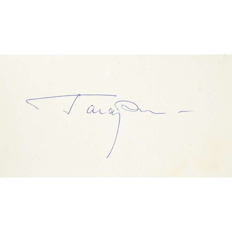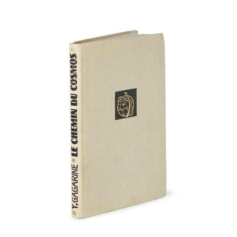 (Space Exploration : Signed Books) 1 Vol. Gagarin, Yuri (Alekseyevich). Le Chemin du cosmos, le premier cosmonaute vous parle. Moscow: Editions en Langues Etrangeres, [196-]. 12mo, original beige cloth, corners just bumped, other negligible wear. Small glue residue in front end paper gutter. Photo plates. Internally clean. In custom half black morocco, gilt, and cloth chemise.