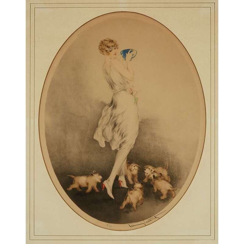(Graphic Art) 1 Piece. Color Etching. Icart, Louis. "Mealtime." 1927. Oval, 18 1/4 x 14 inches; 457 x 355 mm, margins. Lightly to moderately but evenly toned. Signed in pencil by Icart below image at right, with Icart's blind stamp. Framed. Holland 309.