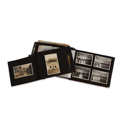 (Travel : Historical Photos) 2 Vols. Photo Albums - Travel - China, South Asia: Album of Vernacular images of Hong Kong and Tsingtao (Qingdo), China (by U.S. Navy yeoman J. W. Bryant, U.S.S. "Pine Island") in 1948. Oblong 4to, original tooled and embossed brown calf with Chinese dragon and pagoda motif; some edge wear. Holding 110 silver print snap shot photos (many 3 3/4 x 2 1/2 inches, a few 4 x 3 inches, largest 8 x 5 3/4 inches), most hinge mounted. Also includes shipboard and other ephemera. Contents in near excellent state of preservation. * Ceylon, Indonesia. Vernacular images, by a British traveler, aboard the "Empress of France," 1925. Oblong 8vo, black wrappers. 30 mounted hand captioned silver prints, 4 1/2 x 2 1/2 inches. Internally clean.