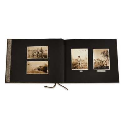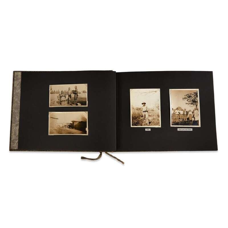 (Travel : Historical Photos) 1 Vol. Photo Album. Colonial Zimbabwe (Southern Rhodesia). Ca. 1920 - 1922. Oblong small folio, snakeskin-patterned cloth. Holding 55 hinge mounted vernacular silver gelatin photos (2 1/2 x 4 /14 to 8 x 6 inches), many captioned, depicting the farming activities of Dick and Jack Fraser and their African (Shona people) workers in Mashonaland. Also includes 3 silver gelatin photos (6 1/4 x 8 inches) of Victoria Lake and the Falls by Percy R. Clark and a photo of the South Africa Union (silver gelatin print, 6 x 7 1/2 inches), by Roberts. Internally in very good to near excellent state of preservation. Ownership of Fraser-Mackenzie, dated "1922" on inside front cover.