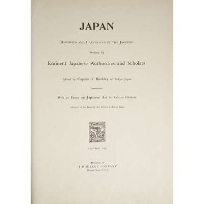 (Asian Subjects) 10 Vols. Brinkley, Captain F., editor. Japan Described and Illustrated by the Japanese. Boston, (1897-1898). "Grand de Lux Edition," #32/50. Folio, original silk over boards, scattered wear. Color collotypes, mounted hand-colored albumen photo prints, other illustrations. Internally clean. With 4 (of 5) silk over board worn chemises. Presumed complete; numbered 1-6, 9, 10, and 2 vols. titled, "The Art of Japan" and numbered 1 and 2. 8 of 10 volume bindings bright and lightly worn, 2 bindings moderately worn. Sold with all faults.
